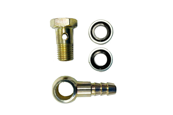 - Штуцер банджо 22-RSN-06 диаметром 12 мм x 8 мм елочка, для подключения шланга обратного слива — 1 шт.